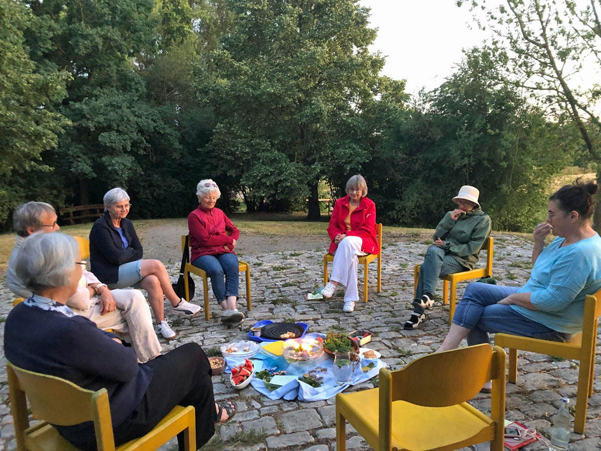 Das Frauenkreistreffen in Euerfeld stand unter dem Motto „Wasser“. Die Kapelle mit Quelle, Bächlein und Teich lädt ganz natürlich zu diesem Thema ein. So ging es u.a. anhand der Metapher des halb mit Wasser gefüllten Glases um die Frage der Perspektive und Haltung, mit der wir auf unser Leben schauen. Der Austausch darüber in Kleingruppen und die Zusammenführung der Gedanken und Erkenntnisse im Plenum waren bereichernd. Das Treffen an der Kapelle endete schließlich mit einem gemeinsamen Sommerabend-Picknick.
