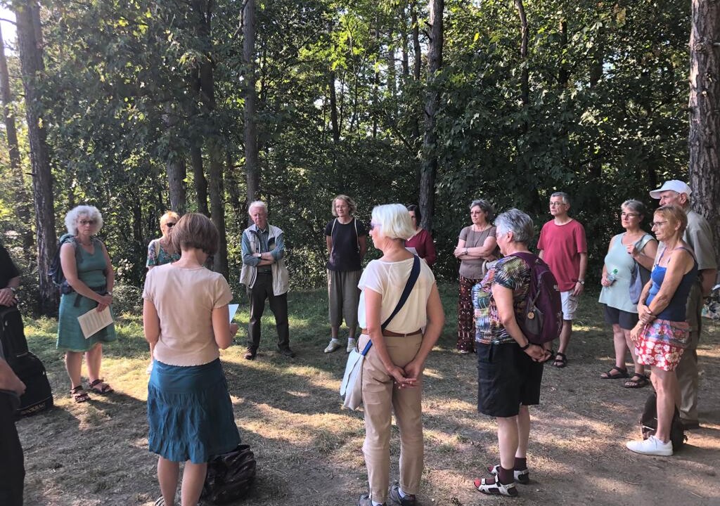 Altersmäßig bunt gemischt waren die 17 Teilnehmerinnen und Teilnehmer, die gekommen waren, um an diesem heißen Septembernachmittag gemeinsam den rund eineinhalb Kilometer langen Pfad durch den Arkauwald bei Löffelstelzen zu begehen. Dabei, so die KLB-Bildungsreferentin Rita Mergler-Spies, sollte der Versuch unternommen werden, „eine Brücke zu schlagen zwischen unseren christlichen Grundwerten und den 30 Artikeln, welche in der Menschenrechtskonvention verfasst sind.“ Insgesamt fünf Stationen hatten die AK-Mitglieder ausgewählt, um dort sowohl den Text der Erklärung zu lesen, aber auch zu beten, zu singen und den Bezug zum eigenen Leben herzustellen.