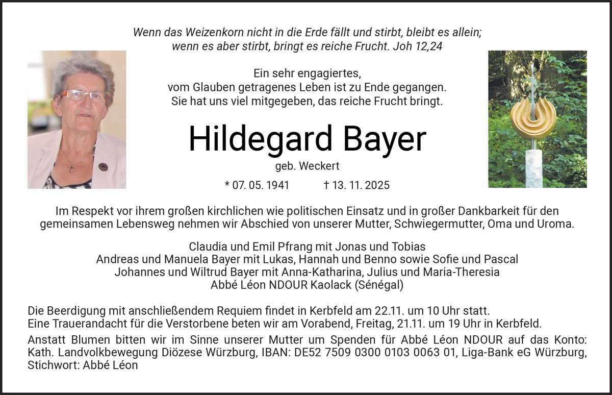Wir trauern um Hildegard Bayer. Und wir sind dankbar für all das, was sie für die Menschen auf dem Land, für die KLB in der Diözese Würzburg und in Bayern sowie für die Diözese Kaolack im Senegal getan hat. Ihrer Familie und ihren Angehörigen fühlen wir uns in der Trauer tief verbunden.