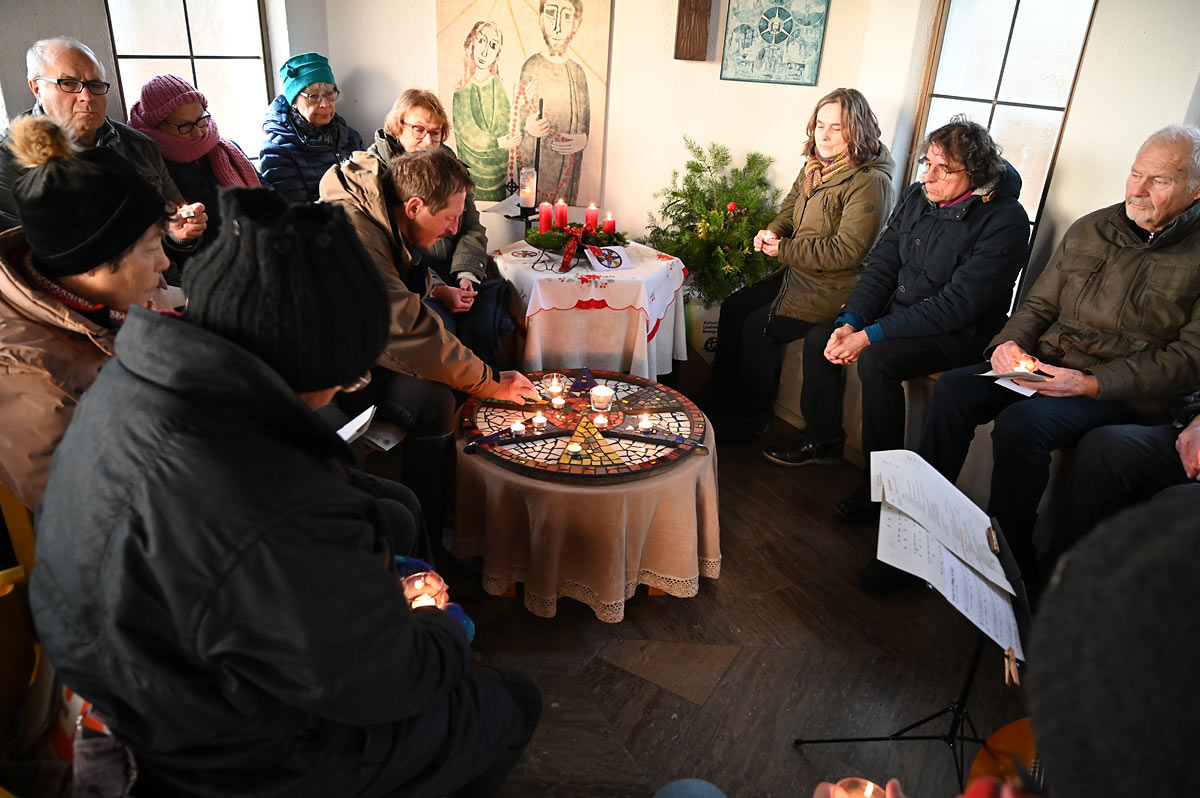 Am Ende des Friedensgebets brannten zwei Dutzend Kerzen in der Bruder-Klaus-Kapelle in Euerfeld. Sie verdeutlichen damit eindrucksvoll die Botschaft dieses Gottesdienstes: Die mehr als 20 Teilnehmenden, die dicht gedrängt im Rund saßen, sollten sich Zeit nehmen, das Licht in sich wahrzunehmen. „Auftanken bei diesem Licht in mir, den Frieden in mir finden“, darum ging es nach den Worten von Landvolkseelsorger Wolfgang Scharl. Dazu diente auch das als farbenfrohes Mosaik gestaltete Meditationsrad nach dem Vorbild des Landvolk-Patrons Klaus von Flüe, das in der Mitte der Kapelle lag. Darauf brannten Teelichter, die von den Gläubigen bei den Fürbitten dort abgestellt worden waren.