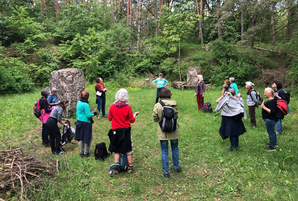 Der Mondweg ist rund 6 Kilometer lang und führt vorbei an 13 Skulpturen aus Muschelkalk, die von verschiedenen Künstlern unter Anleitung des Winterhäuser Bildhauers Thomas Reuter geschaffen wurden. Bei einigen dieser Figuren machte die Gruppe halt, wie etwa bei der Mondguckerin, bei der es um Fragen ging wie „Welche Perspektive wähle ich?“, „Traue ich mich, weiter zu schauen?“, „Was bewegt mich?“, „Was trägt mich?“ oder „Was kann meinen Blick weiten?“ Während die Frauen bei der „Mondguckerin“ ins eigene Herz schauten, war an einer anderen Station Austausch angesagt. In Kleingruppen entstanden „sehr wertvolle und intensive Gespräche“, so Mergler-Spies, bei denen sich die Frauen weit füreinander und ihre jeweiligen persönlichen Geschichten öffneten.
