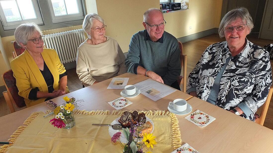 Auf dem mit Blumen geschmückten Tisch stehen Kaffeegeschirr, Kuchen und Getränke und es ist still. Es ist keine bedrückende, sondern eine nachdenkliche Stille, in die hinein Burkard Fleckenstein einen Text aus Charlotte Knöpfli-Widmer "Liebe über den Tod" liest. Der Text handelt von einer alten Frau, die einer Trauernden den Rat gibt "Richte in deinem Herzen zwei Kammern ein“, eine für die Freude und eine für die Trauer. Kommt Trauer über dich, dann öffne die Kammer der Trauer, kommt aber Freude über dich, dann öffne die Tür der Freude. Und mit einem Lächeln fügte sie hinzu: "Den Toten ist es wohler in den Kammern der Freude."